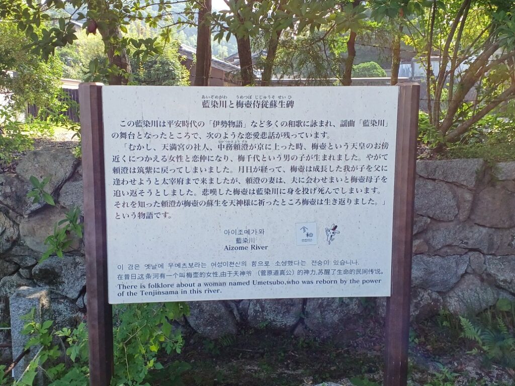 藍染川と梅壺侍従蘇生碑の説明看板。