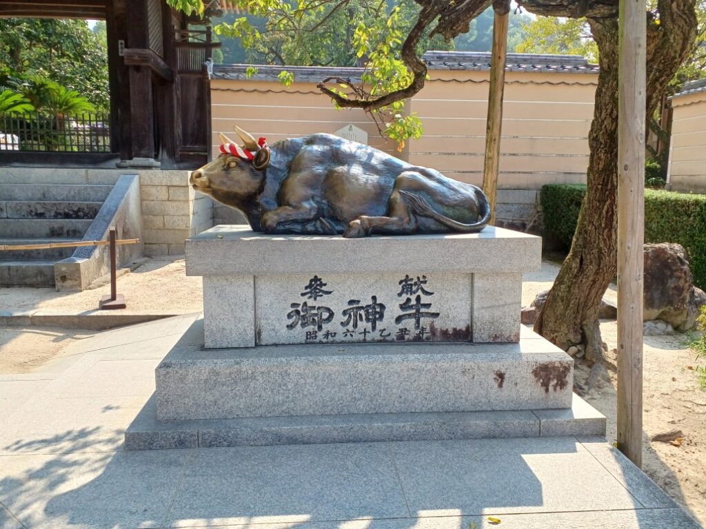 御神牛です。皆に触られて特に頭の部分はピカピカです(;^ω^)