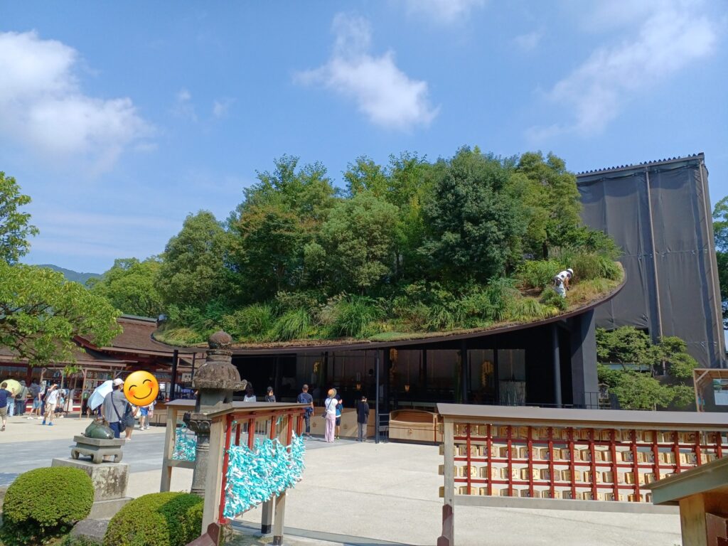 また、現在本殿は124年ぶりに約3年間の改修工事中で参拝することが出来ません。今は替わりの参拝所として、仮殿があります。逆にこの仮殿を見る機会も今だけです。