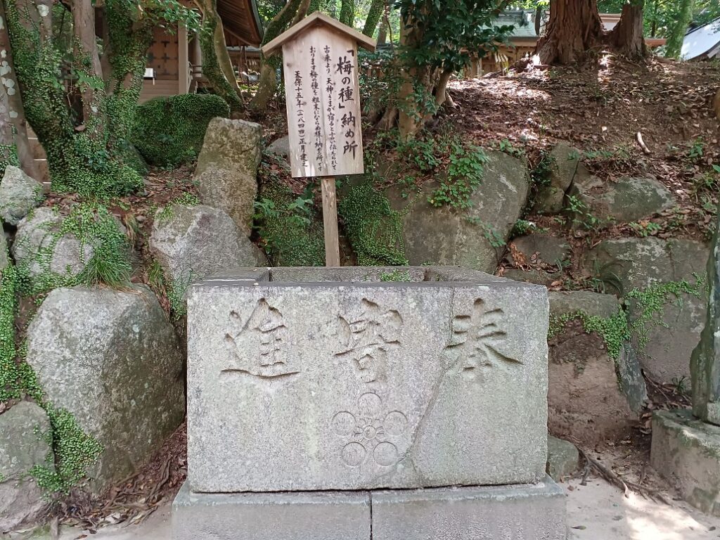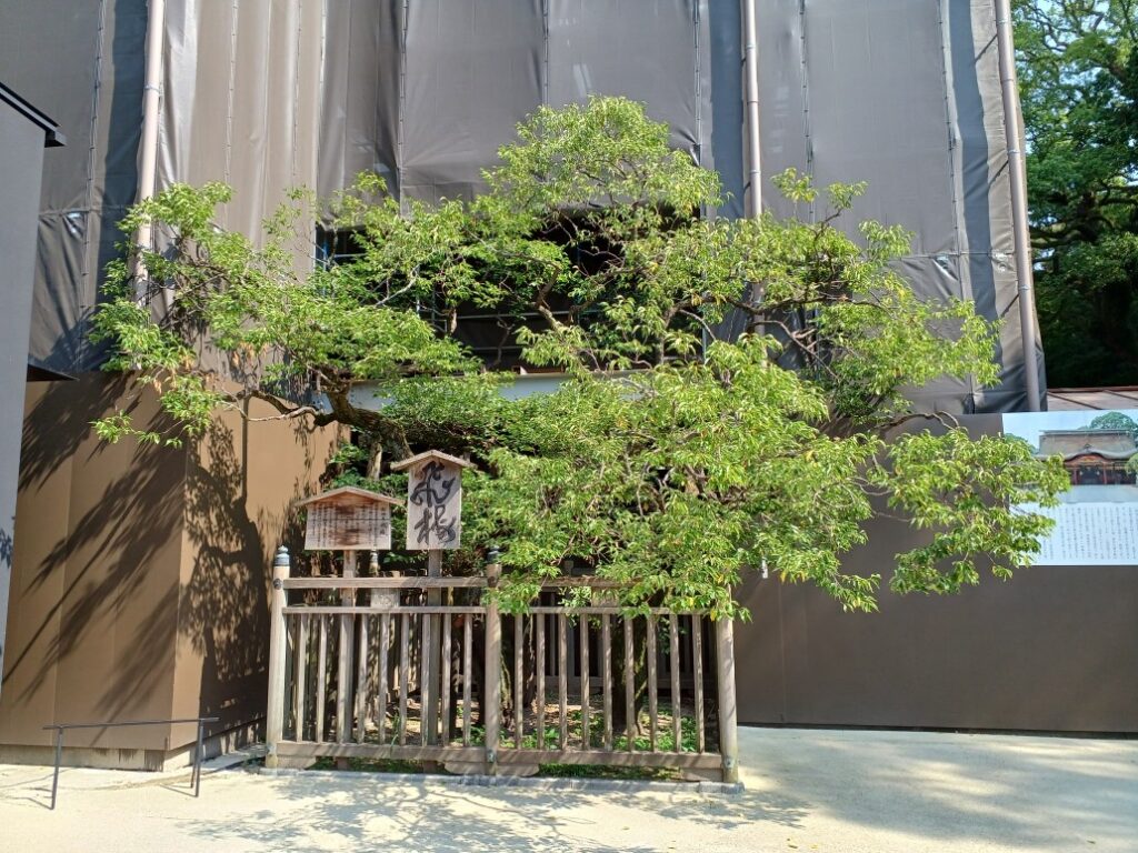 京都から菅原道真を追って飛んできた梅の枝がその後成長した、飛梅(御神木)です。