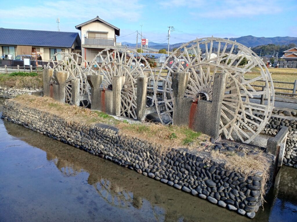 続いて、朝倉市菱野にある「三連水車」です。2022年「水のため息」篇にて放送されました。何と三連水車専用の駐車場があります。CMでは一部しか映ってないので、現地に行って実物を見た時は、しばらく見入ってました。ただ当時私は三連水車は放水時期が決まっていることを知らず、放水してない時に訪れてしまいました。ゆえに水車は動いてませんでしたΣ(゚д゚lll)
