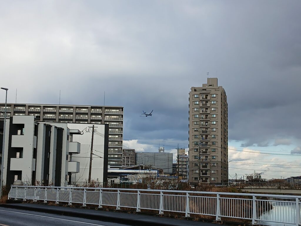 前の投稿でも掲載しましたが、福岡空港が近くにあるので、離着陸する飛行機が頭上を通過します。写真は旋回しながら着陸する飛行機です。