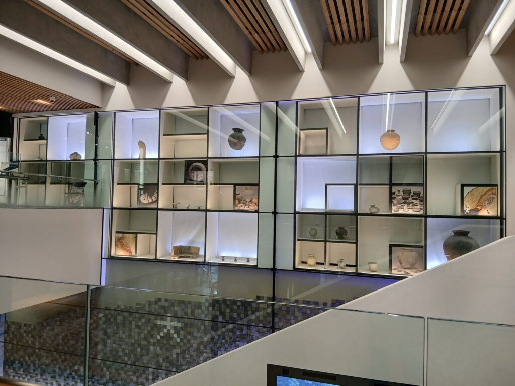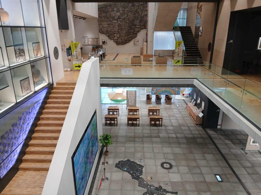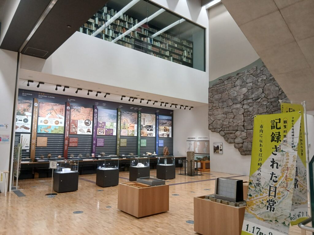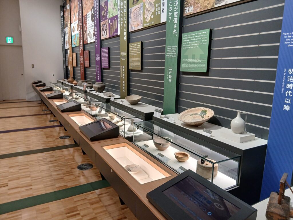 こちらも2階の常設展です。右奥に見えるのは復元された大野城の石垣です。見えないですが、右にクライミングがあって石垣の高さを体験することが出来ます。