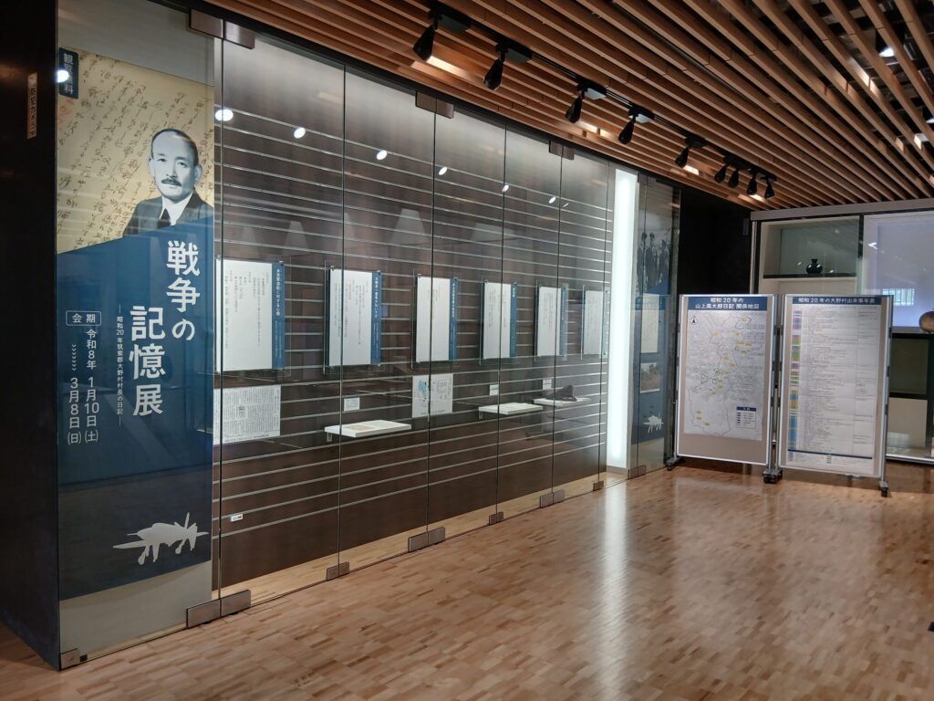 今回の展示では昭和 20 年の山上高太郎日記に注目し、戦時下に行われた軍需工場の地下疎開化や本土決戦準備・村民の避難計画の策定のほか、終戦直後に、戦後処理や進駐軍の対応に追われた大野村の状況について紹介しています。