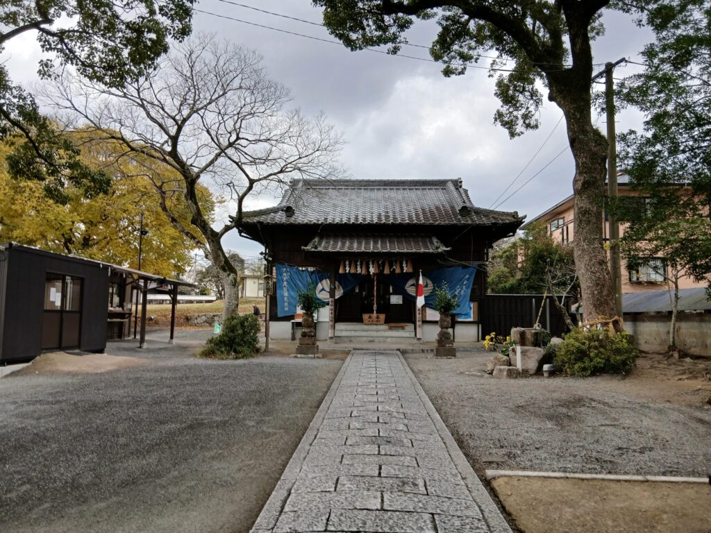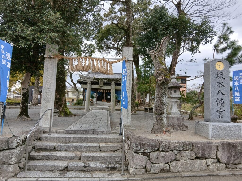 坂本八幡宮です。政庁跡を北西に進んだ場所にあります。応神天皇を御祭神としています。もとは戦国時代の勧進と伝えられている神社で、地元の方々にとっては守り神として大切に祀られてきました。