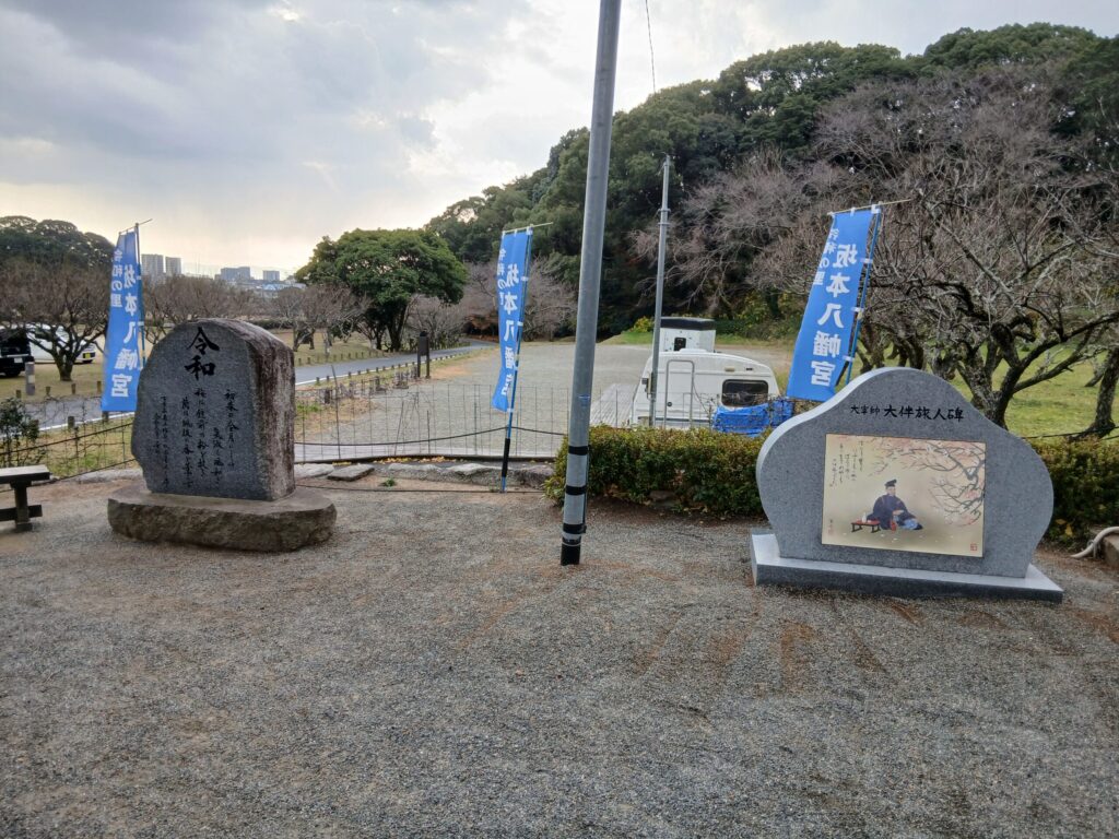 「梅花の歌三十二首」が太宰府で詠まれたことと、この歌の「序文」を引用し名付けられたのが元号「令和」というのは上記の通りですが、この一節が詠まれた歌会「梅花の宴」は当時の太宰府の長官であった大伴旅人(おおとものたびと)の邸宅で開かれとされています。その大伴旅人邸の有力な候補地の1つとして注目を集めるのが坂本八幡宮付近ということです。