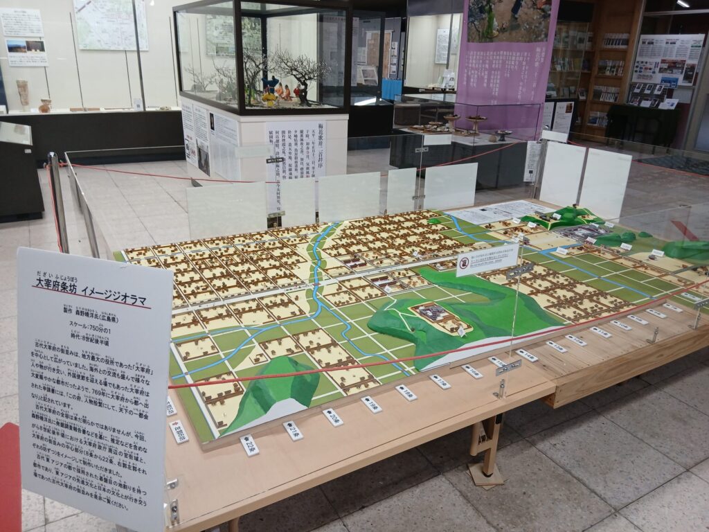 大宰府条坊のイメージジオラマです。大宰府条坊とは、古代に東アジアの都で採用された碁盤目の地割をもつ都市のことです。