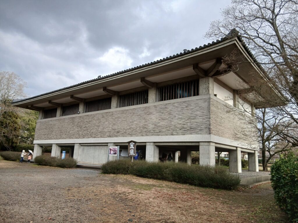 大宰府展示館の建物です。大宰府展示館では、大宰府史跡の発掘調査によって検出された遺構の一部を保存公開し、出土遺物や模型などで大宰府の歴史と文化をご紹介しています。昭和55年の開館とともに(公財)古都大宰府保存協会が事務局を置き、広く大宰府史跡の整備地の維持管理や広報普及、史跡の解説・ご案内などを行っています。