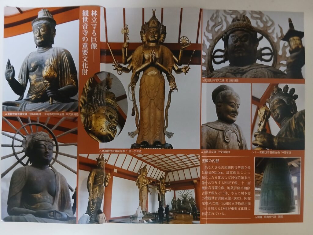 観世音寺の宝殿です。平安時代から鎌倉時代にかけて造られた仏像18躯・石造狛犬・舞楽面などが安置されており、すべてが国の重要文化財です。5メートルを超える仏像もあり、その存在感は圧巻です。その厳かな雰囲気と現地でしか体感出来ないその匂いもまた悠久の時を感じさせます。残念ながら館内の撮影は禁止されてますが、下のパンフレットにある仏像が展示されています。是非足を運んで実際の迫力を体感して欲しいと思います。