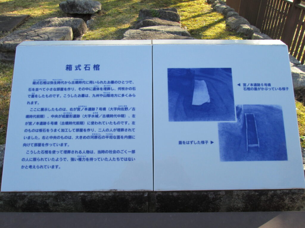 宮ノ本遺跡・成屋形遺跡の発掘調査で検出された箱式石棺を移設、展示しています。