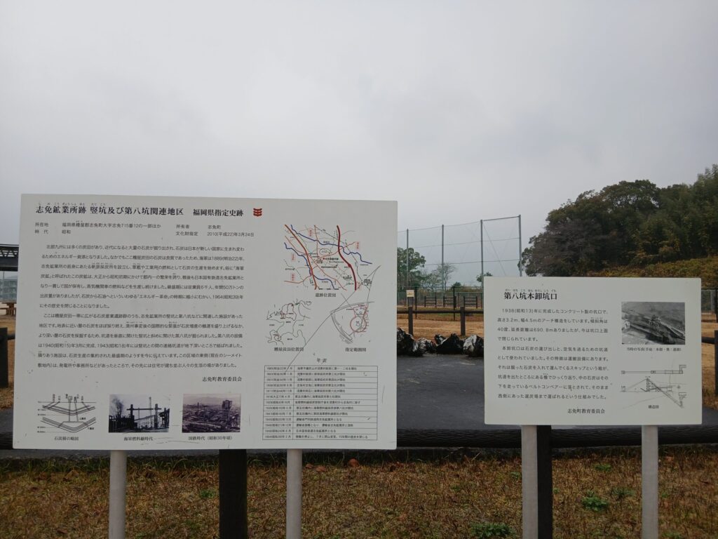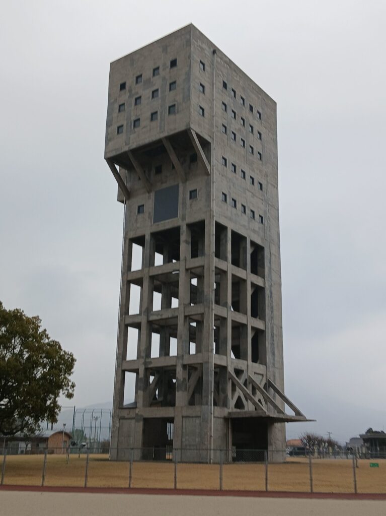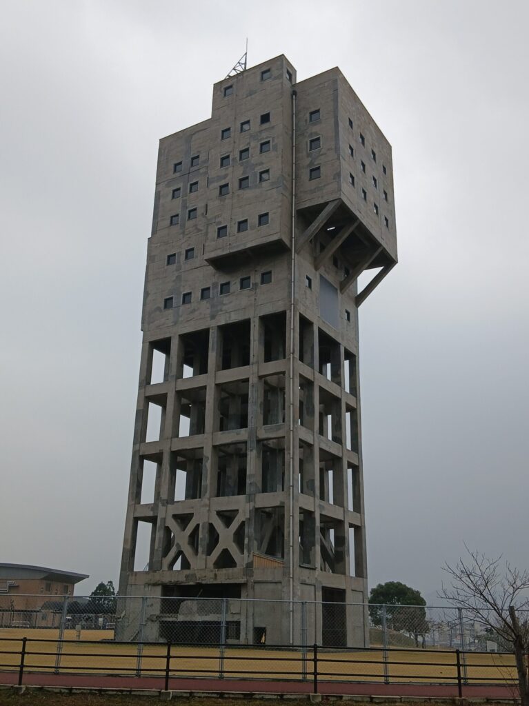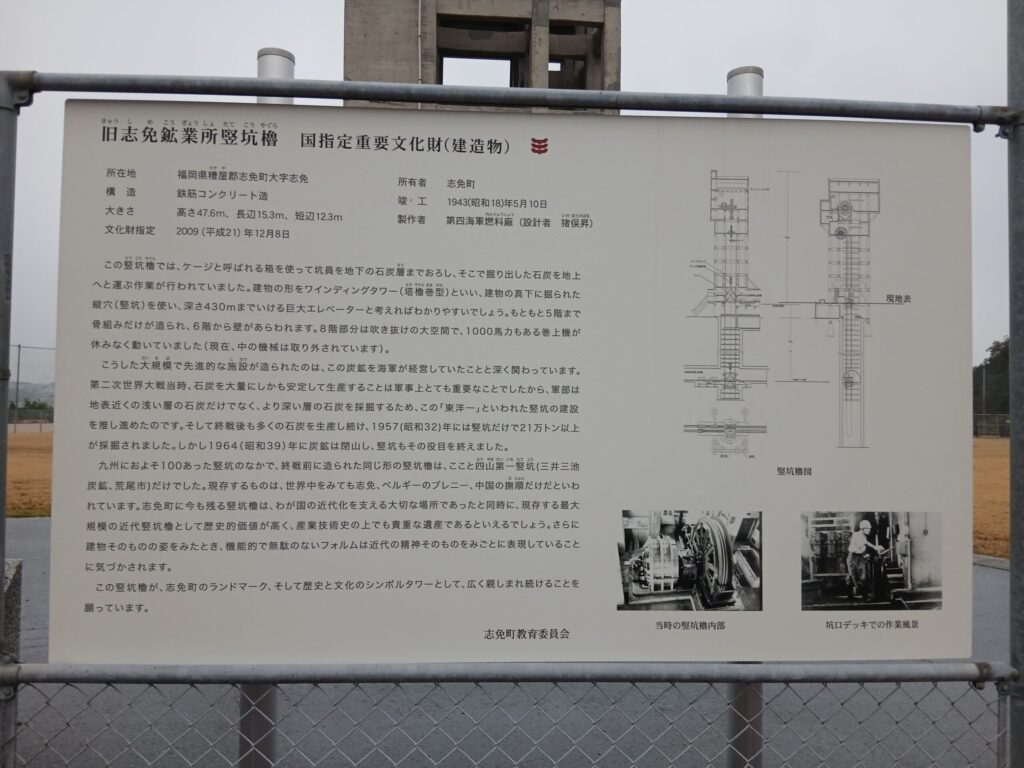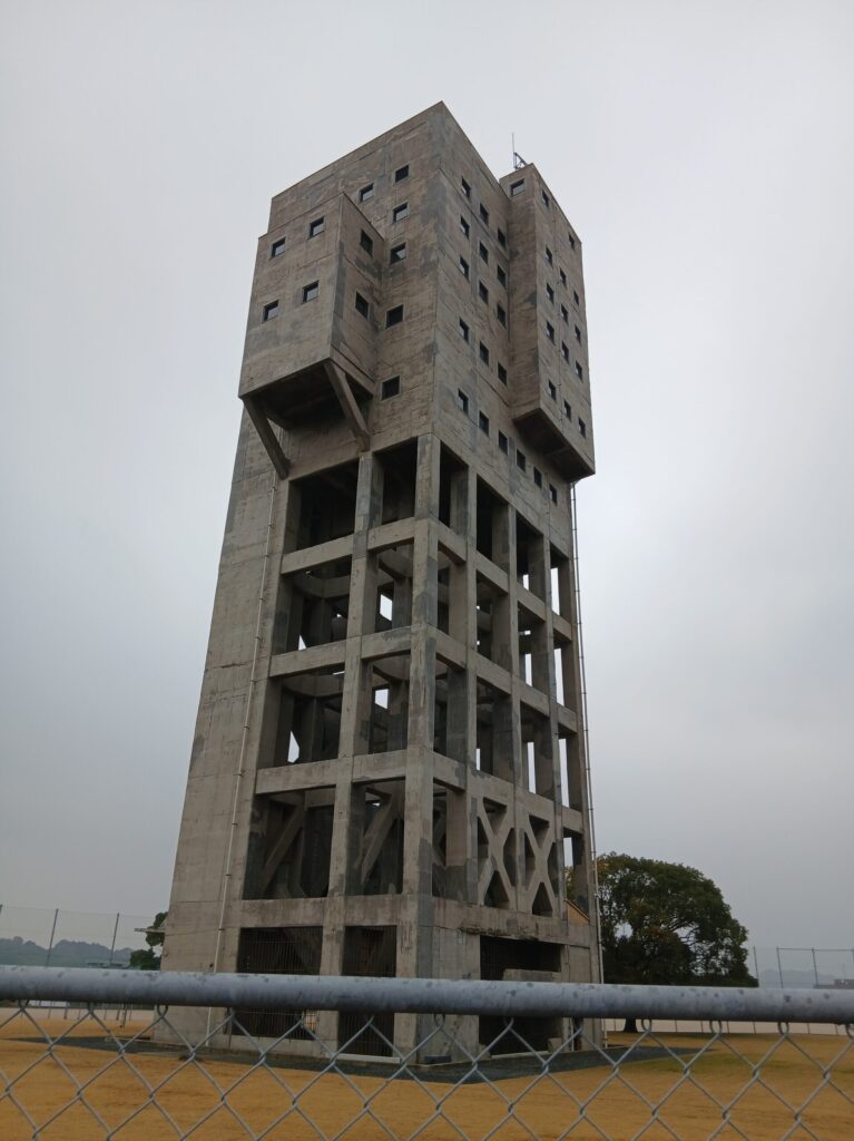 今回は、糟屋郡志免町にある「旧志免鉱業所竪坑櫓」に行ってきました。竪坑櫓とは、艦船用石炭や海軍工廠等で使用する工場用石炭の採掘施設として、昭和16~18年にかけて建設されたものです。櫓の中で最も発達した形式で「塔櫓巻型」と言われ、 「ワインディングタワー」と呼ばれています。石炭や労働者の運搬用のかごを昇降させる巻上機を櫓上部に設置する形式です。また、近代の鉄筋コンクリート構造物の中でも有数の高さを誇る高層構造物であり、近代建設技術史上、価値が高い文化財です。そのことから、2009年に国の重要文化財に指定されました。